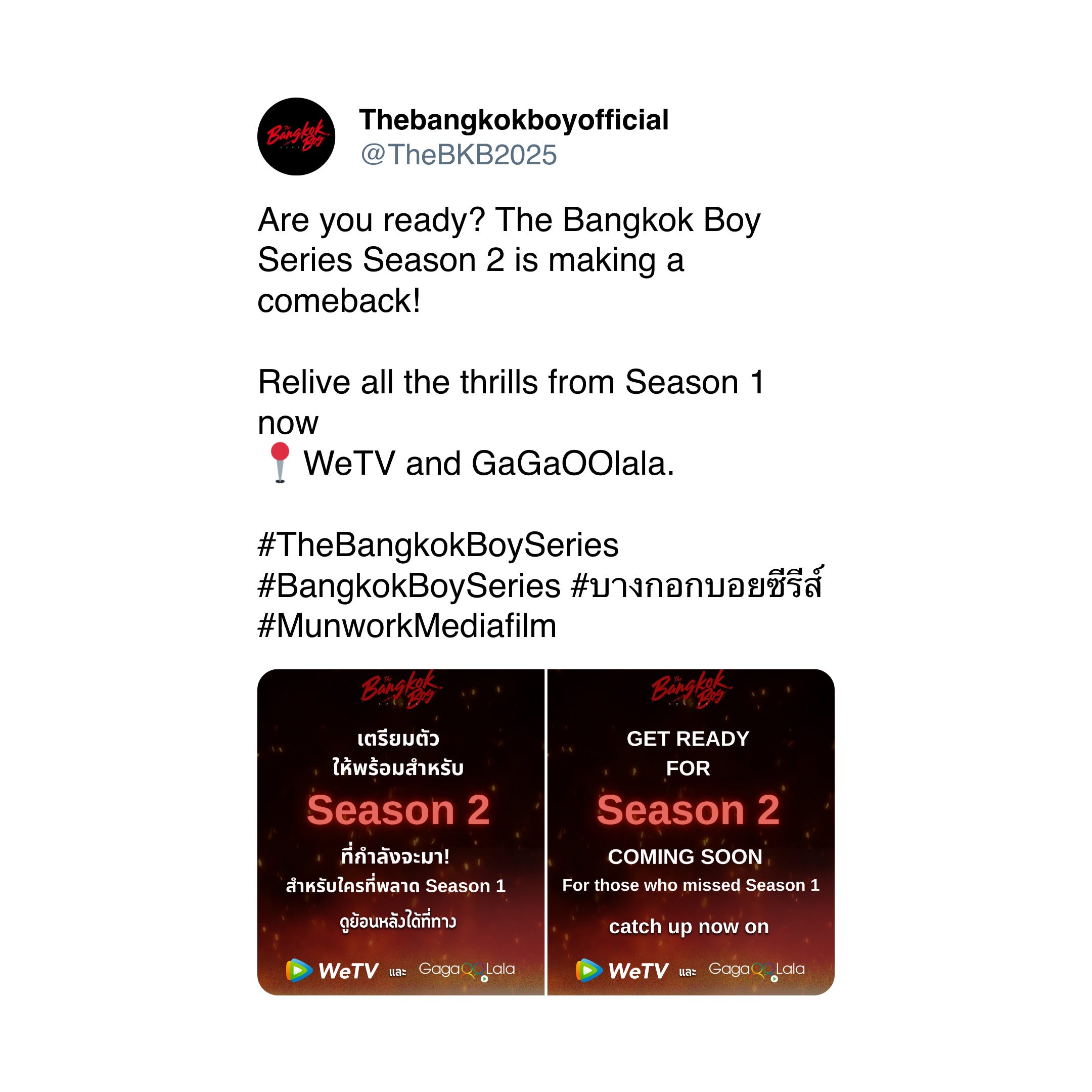 Este 4 de agosto fue anunciada la segunda temporada de The Bangkok Boy. Así lo dio a conocer la producción a través de su cuenta oficial de Twitter (X), donde le pidió a la audiencia estar listx para el regreso de la historia.